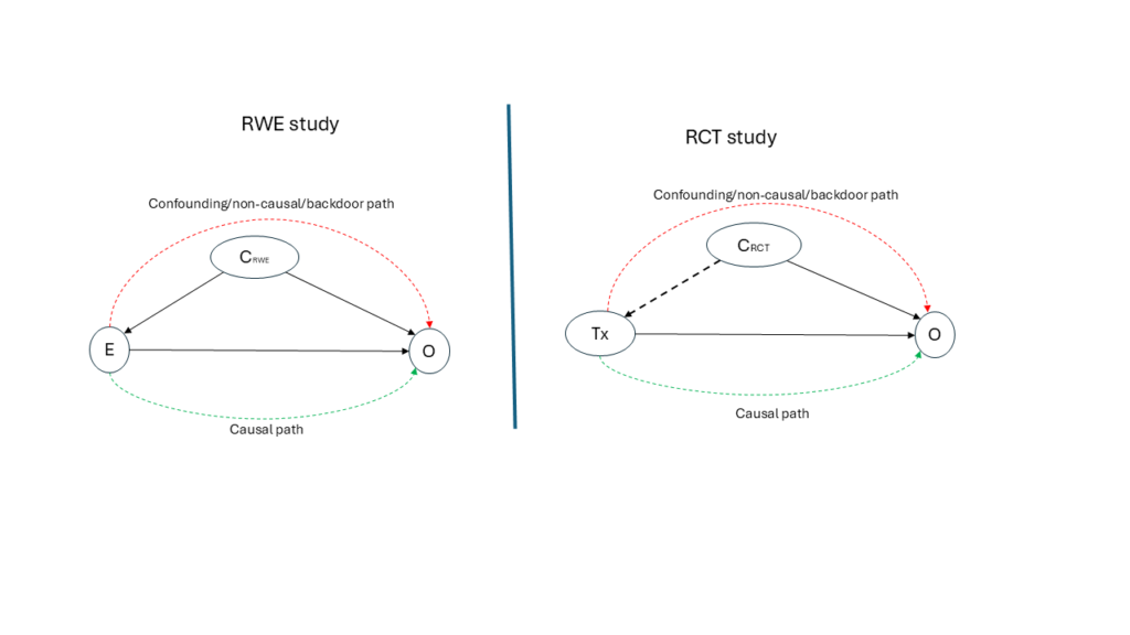RCTs are inherently selective. Eligibility criteria are often strict, leading to study populations that are less diverse and more homogeneous than those observed in real‑world settings. As a result, the number and complexity of potential confounders in RCTs are typically fewer than in RWE studies. In contrast, RWE encompasses broader populations with greater heterogeneity. Although it is commonly assumed that randomisation balances participants across all potential confounders, the process by which confounding variables are identified and considered is rarely made explicit. Structured approaches for confounder selection, such as causal diagrams or directed acyclic graphs (DAGs), are seldom reported in RCT publications. Instead, it is often assumed that randomisation alone suffices, an assumption that may not hold.